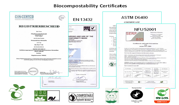 The Bio polymers made up of Poly lactic acid (PLA), Poly Butylene adipate-co-terephthalate (PBAT) from corn, soya and wheat bearsthe OK COMPOST label and complies with the European Norm EN 13432, U.S Norm ASTM D 6400 and International Norm ISO 17088.